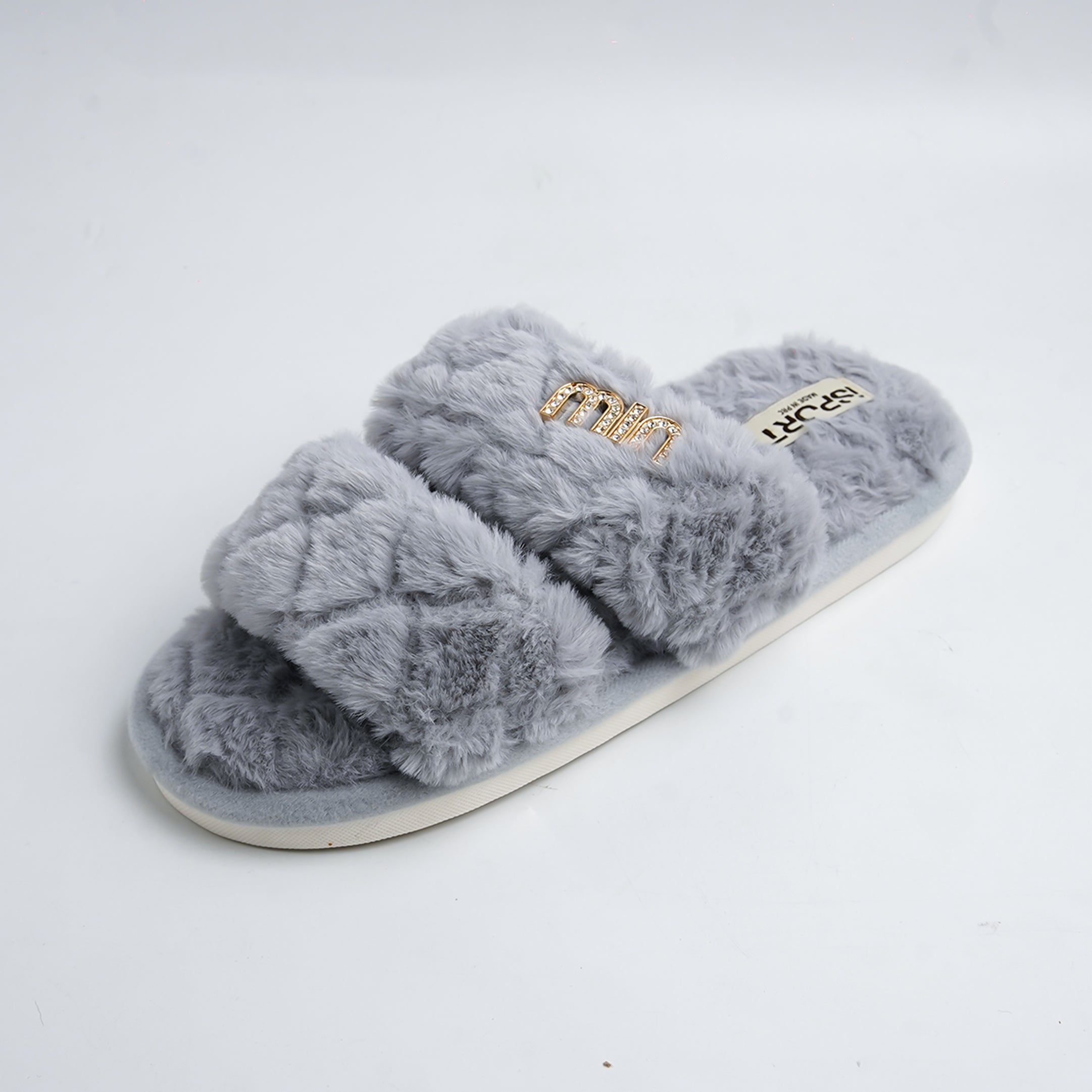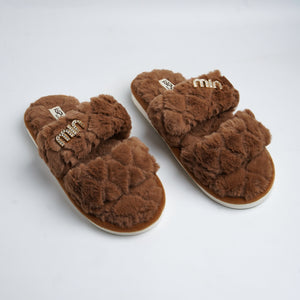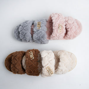 The defining detail of these luxury inspired slides is the elegant gold-tone hardware—a shimmering "MIU" logo encrusted with brilliant rhinestones. This sophisticated accent transforms a classic slipper into a bold fashion statement. Whether you're enjoying a quiet morning at home or stepping out for a quick errand, these designer style faux fur slides ensure you look polished without effort.