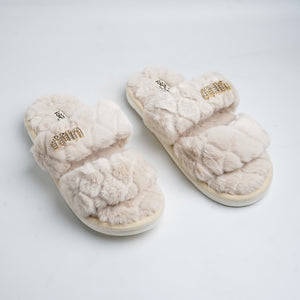 Elevate Your Loungewear: The Plush Logo Slide Experience the perfect intersection of cloud-like comfort and high-fashion flair. The Faux Fur Double-Strap Logo Slides from Alayna Fashion are crafted for the woman who values style even in her most relaxed moments. Featuring two ultra-soft, wide straps with a unique braided-effect texture, these fuzzy double strap slippers provide a secure, cushioned fit that cradles your feet in warmth.