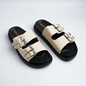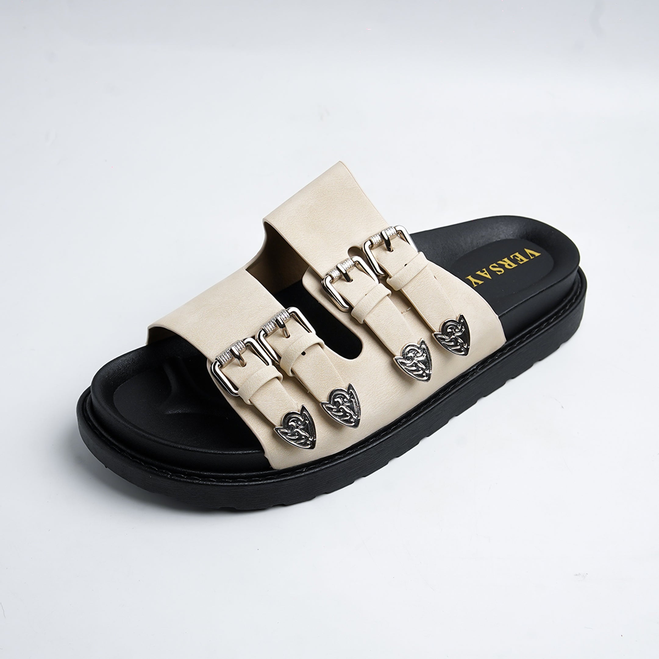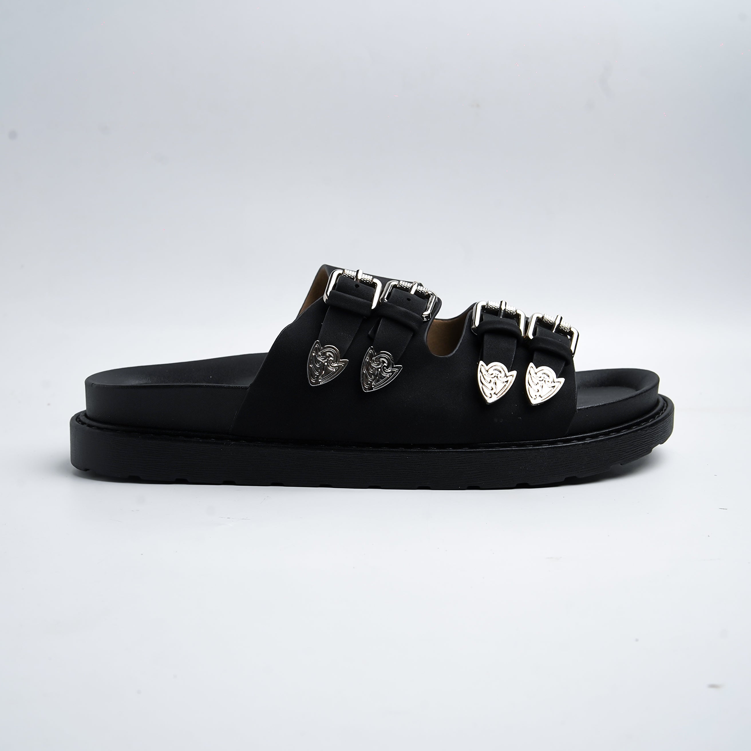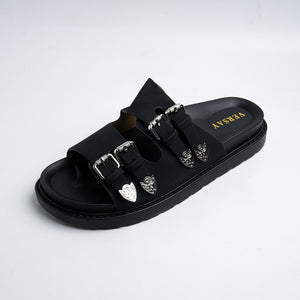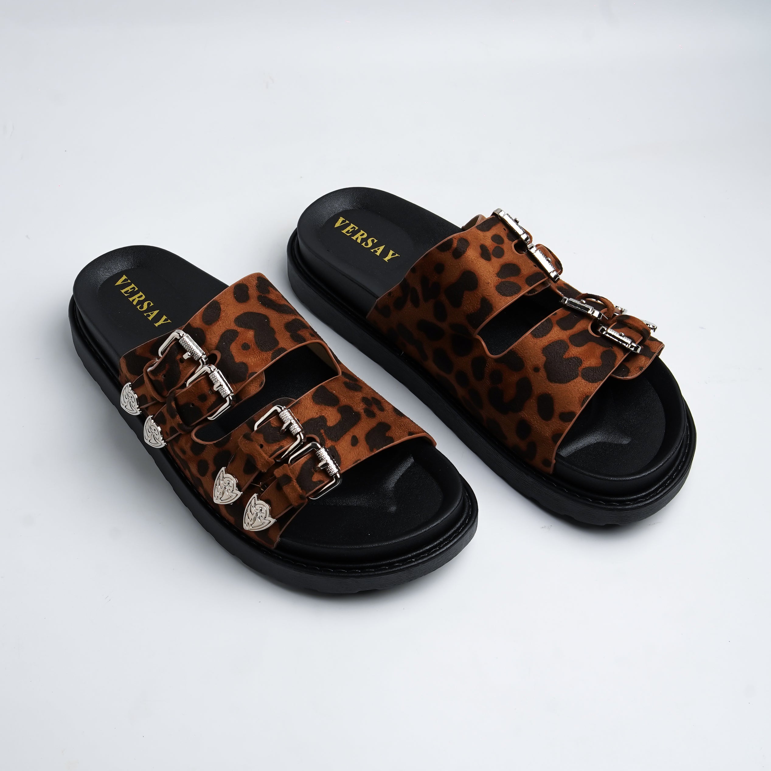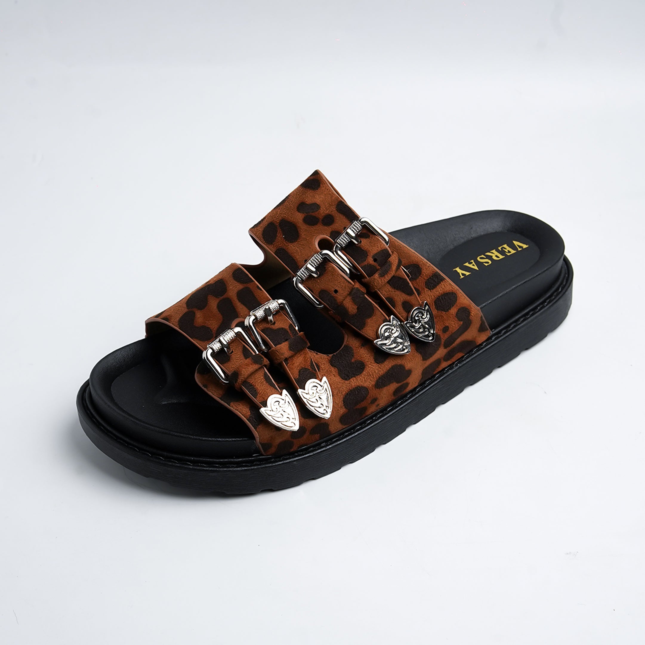 The standout feature is the dual-strap system, adorned with oversized, intricately carved silver-tone buckles. Each strap is further embellished with hanging heart charms, adding a touch of rebellious "Gothic-soft" aesthetic to the bold designs. Whether you choose the fierce leopard print slides or the sleek solid tones, these chunky double-buckle sliders offer a secure fit and a commanding presence.
