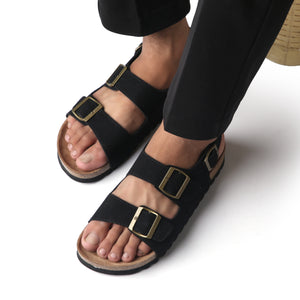 Experience the perfect blend of comfort and style with our Double buckle sandals ,These sandals feature adjustable buckles for a custom fit. The soft foot bed ensures all-day comfort, making them ideal for both casual and dressy occasions. these sandals will keep you looking effortlessly fashionable. Elevate your look our glamourous slides that add a touch of elegance to any outfit.