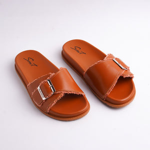 The rich brown tone and soft, smooth upper material provide a luxurious feel, while the frayed edge detailing on the cross-straps adds a unique, fashionable texture that sets these fashion slides apart. A sleek silver adjustable buckle not only serves as a stylish accent but also allows you to fine-tune the fit for secure and personalized comfort. The contoured, low-profile sole ensures a comfortable step for all-day errands or casual outings.