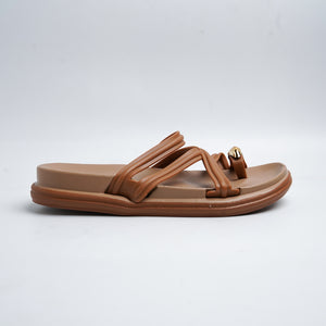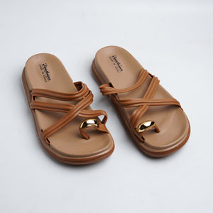 The defining feature of this design is the polished gold-tone hardware on the toe-loop, adding an instant touch of luxury to a casual staple. These women's gold accent slides are built on a smooth, contoured tan footbed that provides a cushioned base for all-day comfort. Whether you’re strolling through a beach resort or heading to a sunny rooftop brunch, these trendy toe-ring sliders provide an effortlessly cool finish to any outfit.