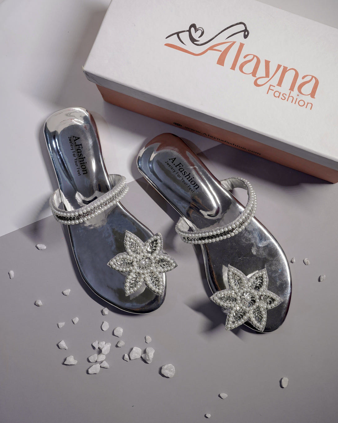 Add a touch of elegance to your everyday style with these beautifully crafted slippers. Designed with delicate sitara work and pearl embellishments, they bring subtle sparkle and timeless charm to your look.