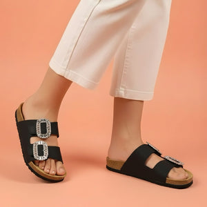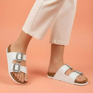 Elevate your daily rotation with the Diamond-Dusk Glam Slides by Alayna Fashion. This article takes the globally loved double-strap silhouette and injects it with pure luxury. The focal point is the duo of oversized, high-clarity crystal buckles that capture the light beautifully, turning a simple walk into a style statement.